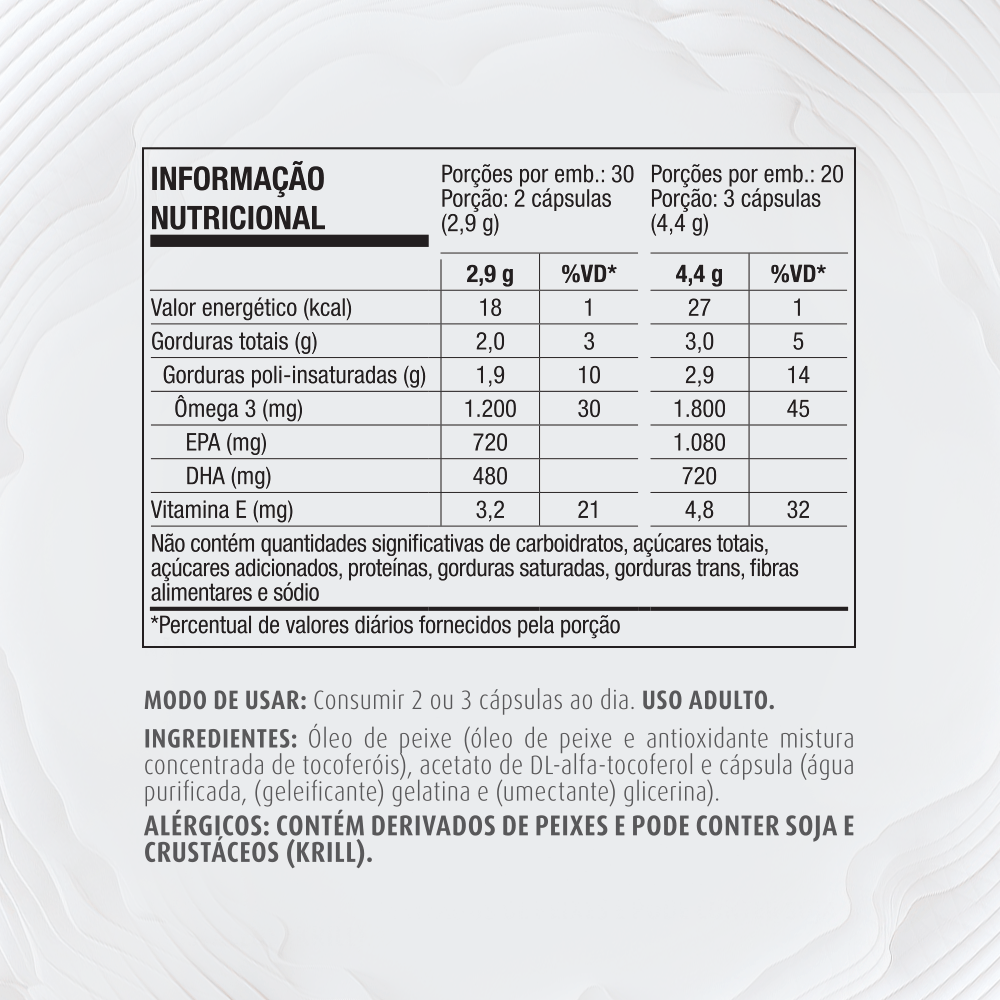 Ingredientes: Óleo de peixe (Ômega 3) e DL-alfa-tocoferol. Cápsulas: Água purificada, (gelificante) gelatina e (umectante) glicerina.