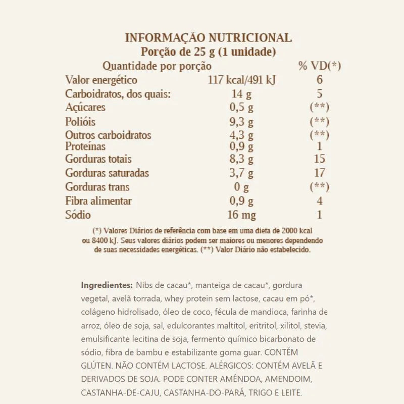 Ingredientes:Chocolate 56% cacau (nibs de cacau*, manteiga de cacau*, edulcorante maltitol e emulsificante lecitina de soja), massa de wafer (fécula de mandioca, farinha de arroz, óleo de soja, sal, fibra de bambu, emulsificantes lecitina de soja e goma guar e fermento químico bicarbonato de sódio), gordura vegetal, avelã, leite em pó integral zero lactose, proteína de ervilha, polidextrose, cacau em pó, whey protein zero lactose, colágeno hidrolisado, edulcorante maltitol, emulsificante lecitina de soja e aromatizante. ALÉRGICOS: CONTÉM AVELÃS, LEITE E DERIVADOS E DERIVADOS DE SOJA. PODE CONTER TRIGO, AMENDOIM, AVEIA, NOZES, CASTANHAS E CASTANHA-DE- -CAJU. CONTÉM GLÚTEN. NÃO CONTÉM LACTOSE.